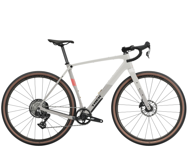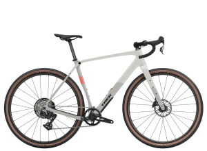Een 500 Series OCLV Carbon frame met een carbon voorvork, opslagruimte in de onderbuis, bevestigingspunten op frame en voorvork, en ruimte voor (effectief) 50 mm brede banden. Een SRAM Rival AXS E1 1x13-speed draadloos schakelsysteem, hydraulische schijfremmen, een carbon zadelpen en tubeless ready Bontrager Paradigm Comp-wielen met 42 mm banden.