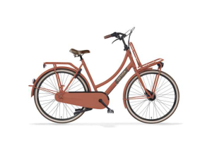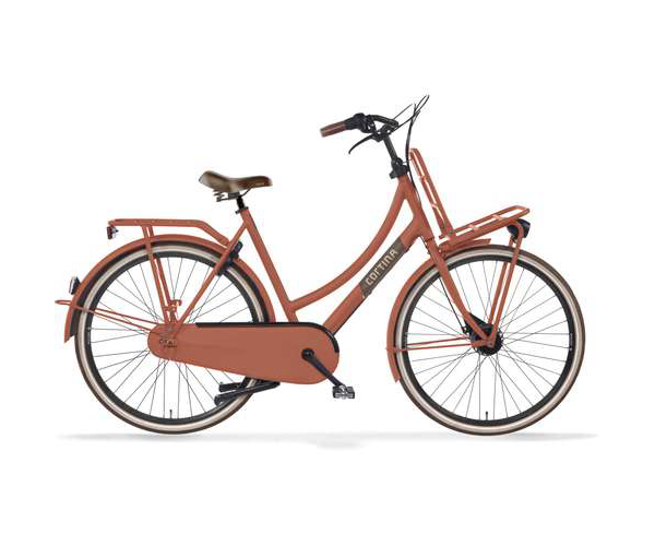 Cortina Transport U4 damesfiets in framemaat 50cm. Kleur: Baked Clay Matte. Uitgerust met achter een Shimano Nexus 7-traps versnellingsnaaf met rollerbrake en voor een Shimano naafdynamo met rollerbrake. Opvallende details: aluminium frame, stuurslot, voordrager.